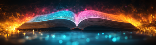 a realistic photograph, of a page of a book, seen from above, close up, with a large illustration, which takes up a lot of space, and text around it, wich is illuminated by light rays coming from the sides and only illu:inates the illustration, with color filter blue, purple, and yellow green lime electric --ar 127:37 --q 2 --s 750