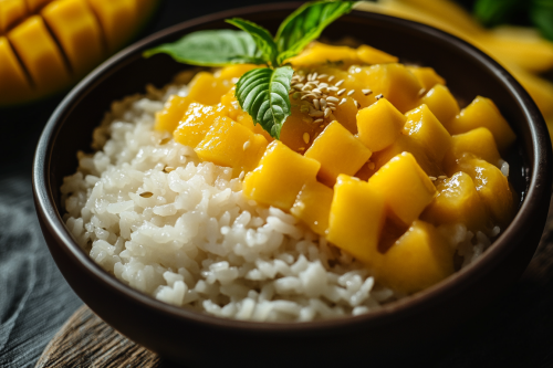 STYLE: Close-up Shot Top view | EMOTION: Tempting I SCENE: Mango Sticky Rice | TAGS: High-end food photography, clean composition, dramatic lighting, luxurious, elegant, mouth-watering, indulgent, gourmet | CAMERA: Nikon Z7 | FOCAL LENGTH: 50mm | SHOT TYPE: Close-up | COMPOSITION: Top view Centered | LIGHTING: Soft directional light | PRODUCTION: Food Stylist --ar 3:2