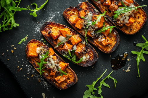 STYLE: Close-up Shot Top view | EMOTION: Tempting I SCENE: Sweet Potato Toast | TAGS: High-end food photography, clean composition, dramatic lighting, luxurious, elegant, mouth-watering, indulgent, gourmet | CAMERA: Nikon Z7 | FOCAL LENGTH: 50mm | SHOT TYPE: Close-up | COMPOSITION: Top view Centered | LIGHTING: Soft directional light | PRODUCTION: Food Stylist --ar 3:2