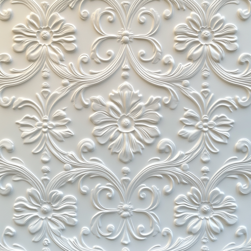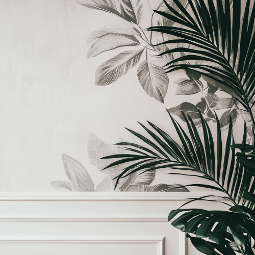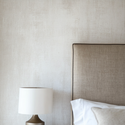 A close-up view of a bedroom wall, showing only a portion of the white wall with wallpaper centered in the frame. The edge of a neutral headboard is visible at the bottom, with a small, minimal lamp peeking in from the side. The focus is entirely on the wallpaper, allowing customers to see the texture and pattern clearly.