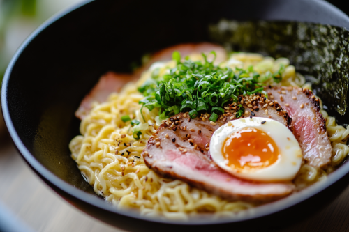 STYLE: Close-up Shot Top view | EMOTION: Tempting I SCENE: Ramen Carbonara| TAGS: High-end food photography, clean composition, dramatic lighting, luxurious, elegant, mouth-watering, indulgent, gourmet | CAMERA: Nikon Z7 | FOCAL LENGTH: 50mm | SHOT TYPE: Close-up | COMPOSITION: Top view Centered | LIGHTING: Soft directional light | PRODUCTION: Food Stylist --ar 3:2