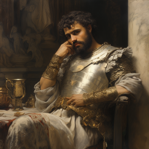 a painting by Edwin Lord Weeks depicting a portrait of a bored Roman prince with a beard wearing silver armor accented with gold engravings