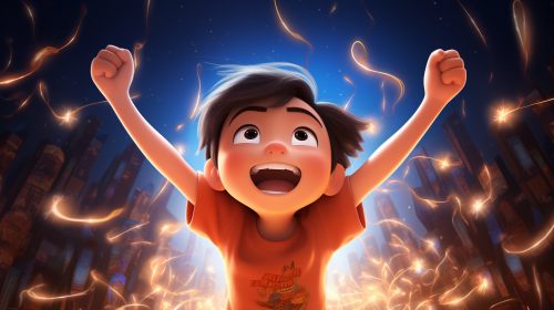 pixar style cute 7 year old Asian boy wrapping his arms around him, hugging himself, loving himself, self-love, big love feeling, Background Pixar-style animated setting, visualize connected luminous threads hearts of light shining brighter. Emphasize emotional connection, nurturing moments, and Pixar's rich emotional depth, --ar 16:9
