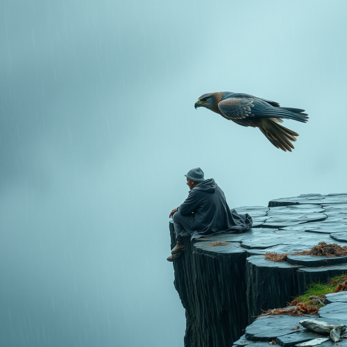 Deep forest outpost, dungeons and dragons style Dark Fantasy, foggy and rainy forest. An outpost sits above a trail build from stone and rock, rain falls and the roof sheds the water down into a creek. The outpost is small cozy and comftable with smoke coming from word burning stove. There is a patio watch station in front thyat oversees the road in. There are also stone monuments on the trail into the outpost --ar 7:4