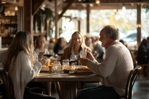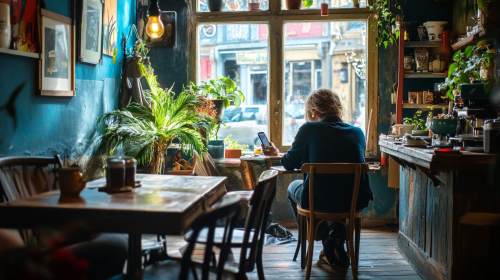 Movie still, documentary photography, editorial style in the manner of Martin Parr. A person sitting alone in a cozy café, focused on their phone. The café has a warm and inviting atmosphere, with rustic wooden tables, soft lighting, and small decorative details like coffee cups, plants, and pastries on the counter. The person looks relaxed, with natural light streaming through a nearby window, casting soft shadows. Photorealistic, intricate details in the person’s clothing, the phone, and the café decor. 35mm film aesthetic, blue light, wide aspect ratio --ar 16:9