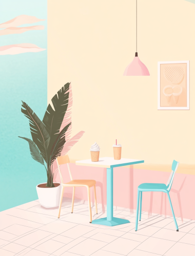 Unmanned. A space without people. Illustration from the 80's. Flat design. The outline is thick. Retro illustration. Pastel colors. Retro atmosphere. A cozy cafe with colorful posters. cute. Ice cream and coffee are on the table. Fashionable and pop. --ar 49:64