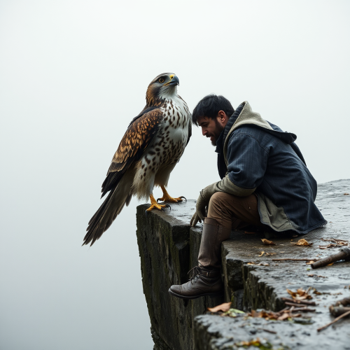 Deep forest outpost, dungeons and dragons style Dark Fantasy, foggy and rainy forest. An outpost sits above a trail, rain falls and the roof sheds the water down into a creek. The outpost is small but looked after, cozy and comftable with smoke comming from word burning stove