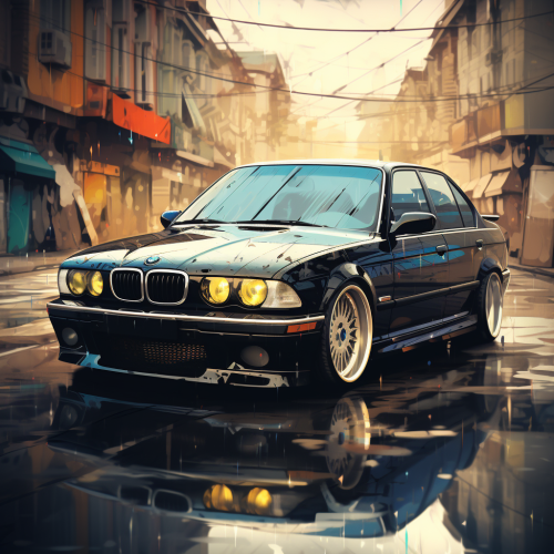 bmw m5 e38, background - Russian city of the 90s, rainy weather, drops on the car, digital painting style