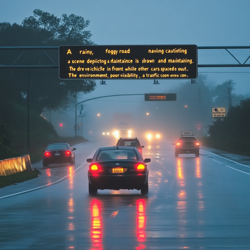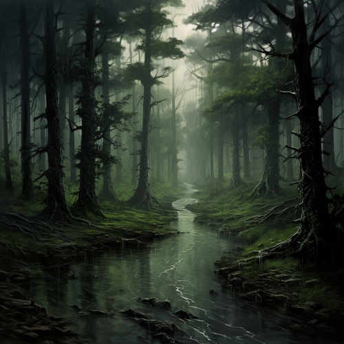 Deep haunted forest outpost, dungeons and dragons style Dark Fantasy, foggy and rainy forest. An outpost sits above a trail build from stone and rock, rain falls and the roof sheds the water down into a creek. The outpost is small cozy and comftable with smoke coming from word burning stove. There is a patio watch station in front thyat oversees the road in. There are also stone monuments on the trail into the outpost --ar 7:4