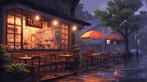 black and white sketch-storyboard, a man sitting at a table near a window in a cafe, the man looks out of the window:: a cup of coffee and a dessert on the table, a rainy cityscape outside the window