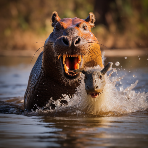 Capybara attacking Nile crocodile by jumping on his head