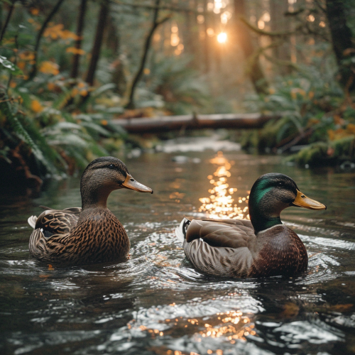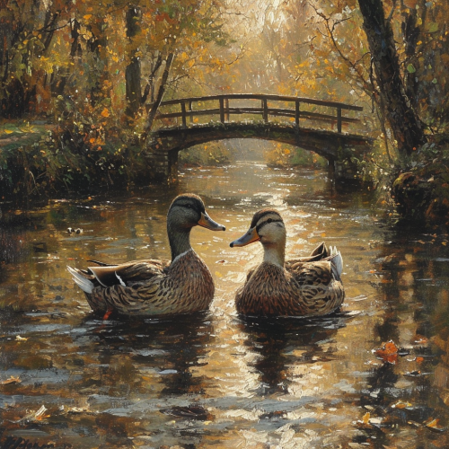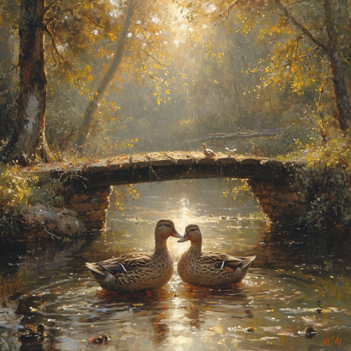 two ducks in love swimming in a river near a low wood bridge in a sunbeam --s 750 --v 6.0