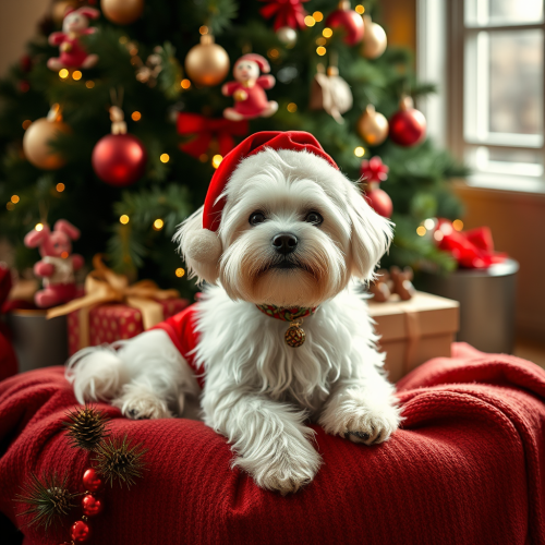 Christmas card featuring a cute happy yellow Labrador puppy wearing a Santa hat, in a watercolor style on a christmas tree, and gift boxes cute colors background --ar 49:69