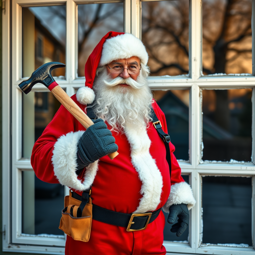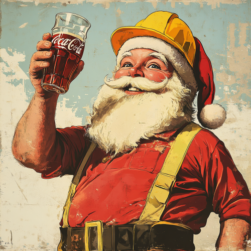 an graphic design illustration poster for a Santa Clause wearing a yellow construction hat and holding a Coca Cola glass in vintage poster style, maximalist, retro