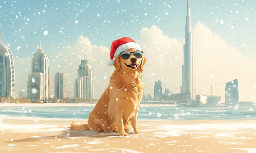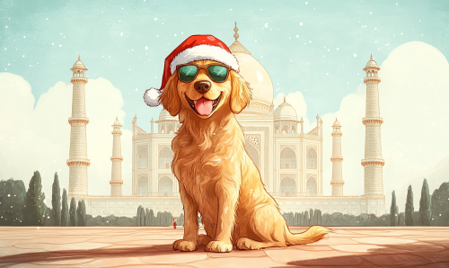 illustration of a happy Golden Retriever sitting in front of the Taj Mahal with sunglasses and a Santa hat on , drawn in the style of Oliver Jeffers, soft light, pastel colors, Christmas theme, childrens book illustation --ar 5:3 --v 6.1