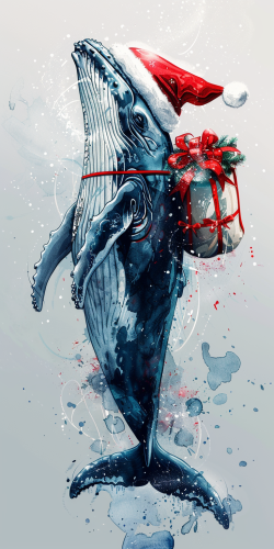 A humpback whale dressed in a Santa hat with a sack of gifts tied to its back. by joey moya horse, with dynamic strokes conveying a sense of energy and movement. in the style of minimalistic drawings, ultrafine detail, light,bright blue, white background, mori kei, painted illustrations, serene faces --ar 1:2 --stylize 250 --iw 2 --v 6.0