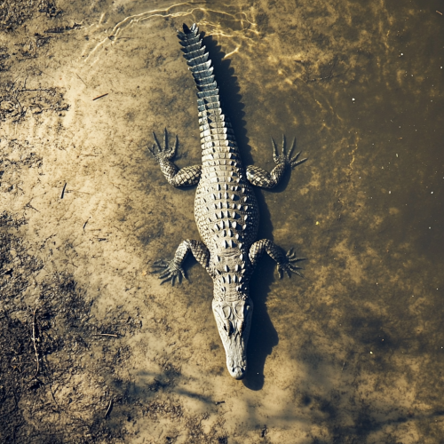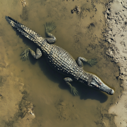 top view of a crocodile swimming with its limbs extended backwards. We see the shadow on the bottom of the water. The water is dirty and covers some parts of the crocodile. and the shadow at 1 meter depth. Realistic photography. Natural light. --s 50