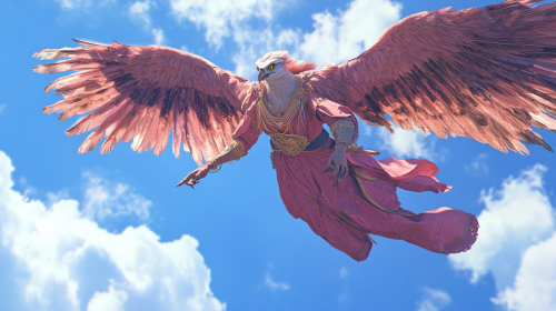 elegant female aarakocra monk, flying through sky, beautiful wings, wearing long beautiful pink robes, bird feather face, noble expression, style of video game concept art, --ar 16:9