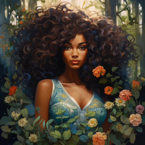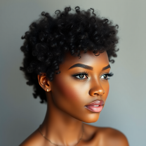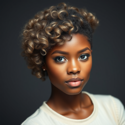 Afro Carribean lady with Asiatic facial features, slight moon face, nose like vietnamese and Nigerian mixed, nose slightly broad, with flat nose bridge, small, lips slightly pink, eyes slightly squinted like Akan lady, skin complexion not too dark, 4b hair type with curls, slight streaks of grey hair barely visible, Sony FE 12-24mm f/2.8 G Master shot, ultrarealistic image, pretty --s 750