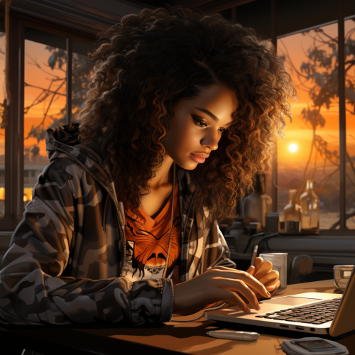 Young African American lady in a beautiful house on her mobile at a table at night in dimly lit room in comic style. --s 750