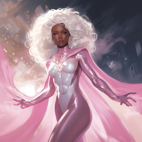full body illustration of an african american superhero with flowing white hair, she has a large oval pink jewel in her forehead, her outfit is of pink spandex, she has white gloves, she has magenta energy flowing all around her, full body image, esad ribic comic book style