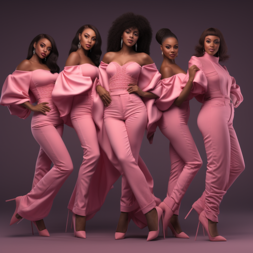 animatied highly realistic group of beautiful african american women, wearing pink. fullbody with heels on, fashion