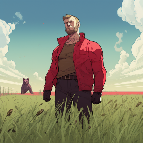 a guy standing in a field with a bear next to him in the style of Jamie Hewlett --s 50