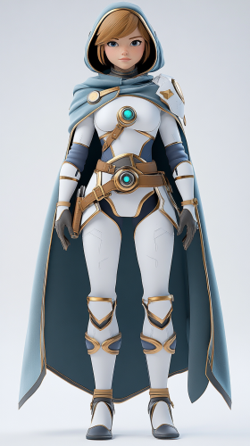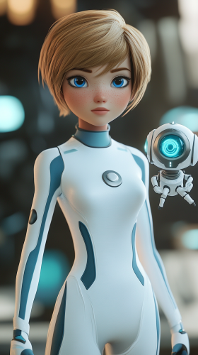 Disney style 3D animation, original character, sci-fi heroine, Disney sci-fi space princess, short light brown hair, blue eyes, white and blue clothing, cute little floating robot companion, full-body --ar 9:16