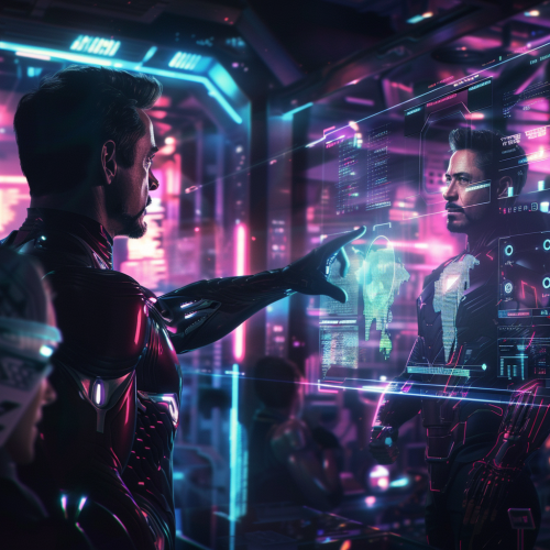 1980s Sci-Fi Art Style, detailed illustration, high contrast: A cybernetic hero in a high-tech food lab, sampling a piece of synthetic, geometrically perfect cake, with robotic arms preparing dishes in the background.