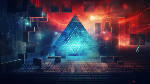 a concrete wall with holographic with intricate symbols, sci-fi background, puzzles of reality, red and blue holography, hard sci-fi --ar 16:9