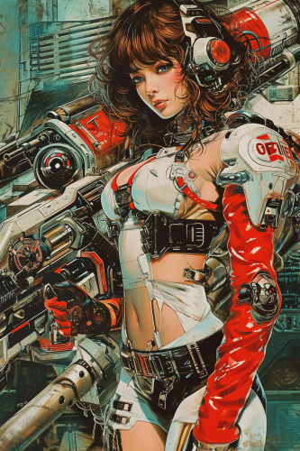 1980s japanese propaganda manga sci - fi magazine cover, femme fetale, meticulous military scenes, mecha anime, female glamour model, instamodel type, full body, japanese prints --ar 2:3 --v 6.0