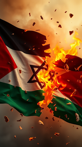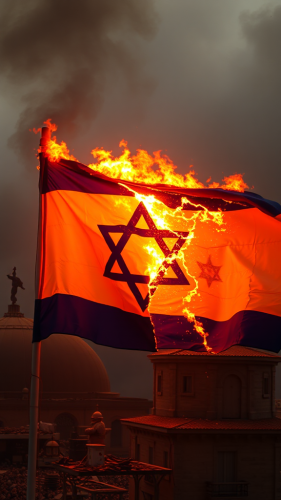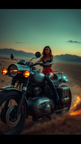 Surrealistic Photo of a beautiful woman standing on a small table. She is in the desert. The table is burning. Midriff showing. Firelight on skin and clothes. Camels and sheep --v 6.0 --s 1000 --ar 19:12