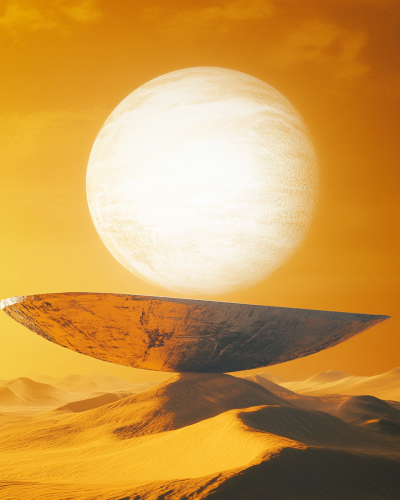 A professional photo featuring desert and dune in yellow and golden tones in the background, with sunlight shining from above. In the foreground, there is an oval platform, sculpture and large white sun in the sky . The oval platform is flying in the air, creating a surreal and ethereal atmosphere. A cinematic still of a massive. Large panoramic view can see the Sky behind, the sky is cloudless. The overall look is sad and contrasting between the sky and the sand desert --ar 4:5