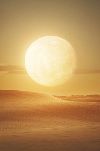 photo background, A professional photo featuring desert and dune in the background, with sunlight shining from above, sculpture and large white sun, sunset. In the foreground, there is an oval platform, The oval platform is crystal, creating a surreal and ethereal atmosphere. Large panoramic view can see the Sky behind, the sky is cloudless. The overall look is sad and contrasting between the sky and the sand desert, in yellow gold and black tones, univers, surreal cosmic scene --ar 4:5