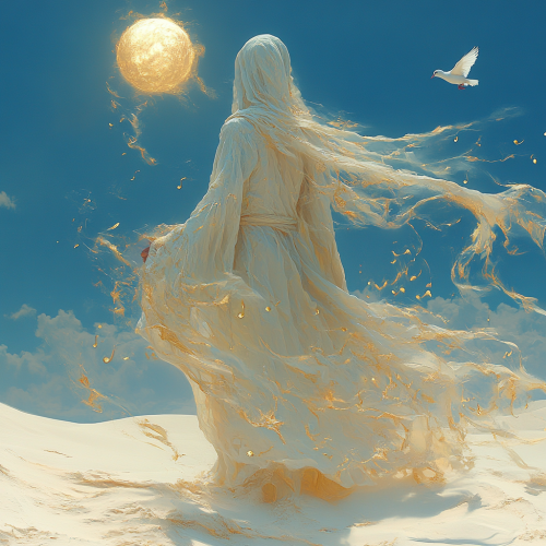 a highly detailed image of a person in a white flowing robe, wearing a hood, face hidden, standing in the open white sand dunes, in the desert, facing the sun, vibrant, shiny gold music notes streaming from the person's heart up to the sun, blue sky gradient to dark blue, a single white dove flying with a small olive leaf branch in its mouth --s 750