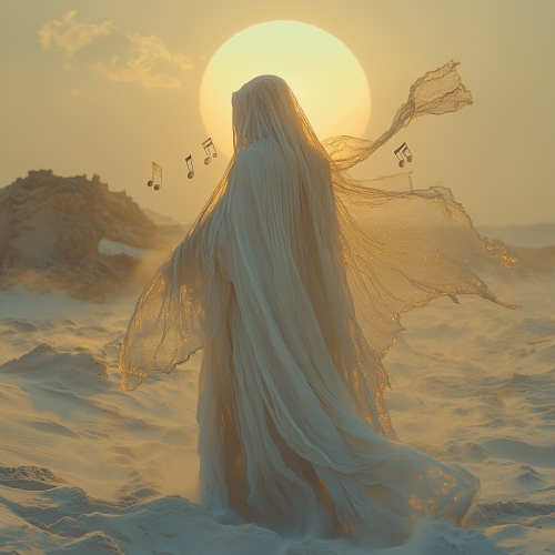 a person in a white flowing robe, with a hood, facing towards the sun in the desert sky, 4w landscape photography, 16mm lens, white sand dunes, sand whipping through the air, shiny gold music notes streaming from the person to the sun --s 750