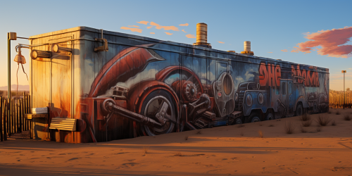 wall mural painting of madmax theme on a riders container cafe design,desert area,burningman --ar 40:20