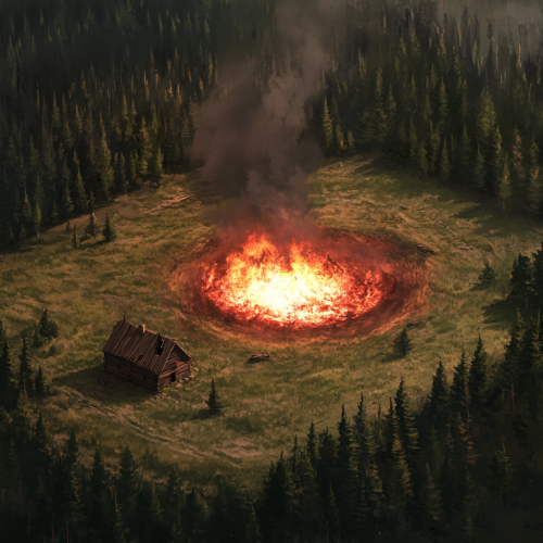 Misty taiga, aerial view, an old solitary wooden rural house in Slavic style, next to it a large empty grassy field with a huge burning meteor crater, the fire is bright red-pink. The image is in a semi-cartoon style.