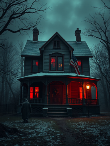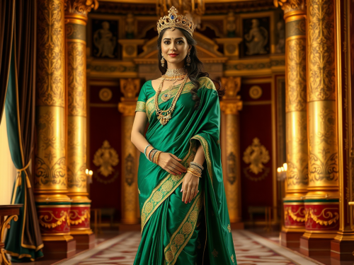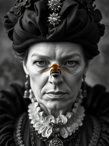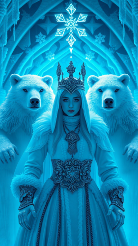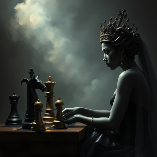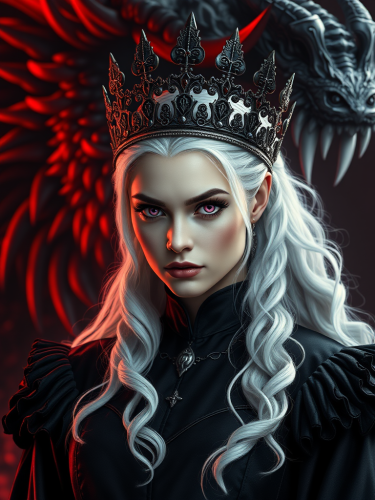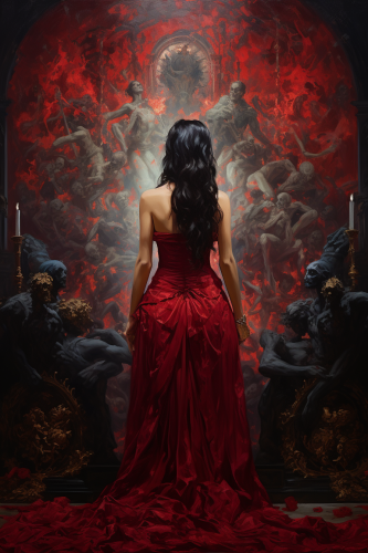 back view of a beautiful Queen with black hair and crown wearing a red royal dress. She is standing in an hall looking at a tapestry but it’s full of dark, beastly, swirling black mist and hands coming out of it trying to grab her in, skulls and death contrast of her beauty and the darkness in the tapestry. --ar 2:3 --v 5.2