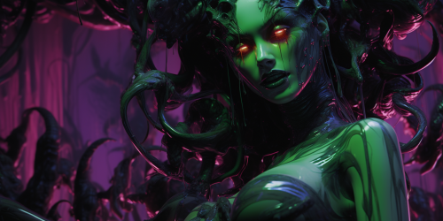 black latex hell, demonic, vibrant green and purple light reflections --ar 2:1