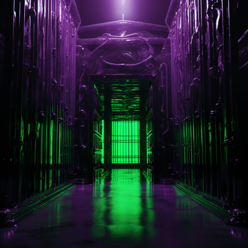 empty black latex gate of hell, shiny, demonic, vibrant green and purple light reflections, balenciaga commercial