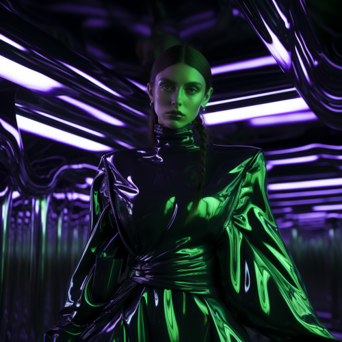 black latex hell, demonic, vibrant green and purple light reflections, balenciaga commercial