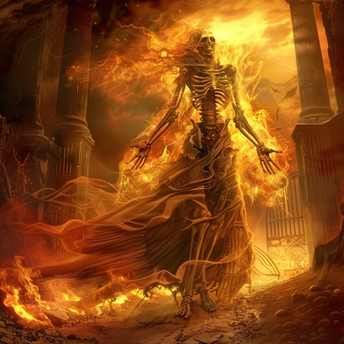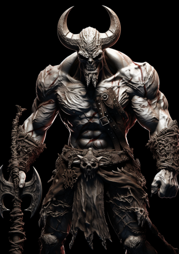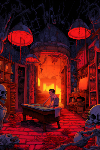 detailed illustration of a scene takes place in a demonic massage studio in hell with a giant evil demon giving a lady a relaxing deep tissue massage on a massage table, filled with crystals, bottles of essential oils, menacing flames , dripping red wax, lost souls, skeletons on fire --v 5.1 --ar 2:3