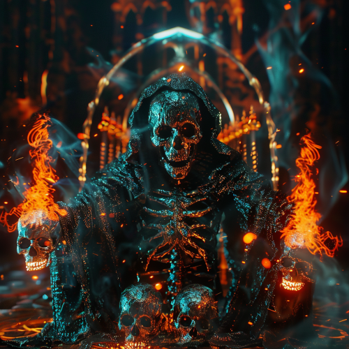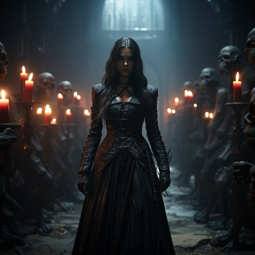 Necromancer, vampire, assassin, beautiful woman, long black hair, attractive body, aggressive stance, black leather robe, Dark Fantasy Hell environment, skulls, 8K --s 750
