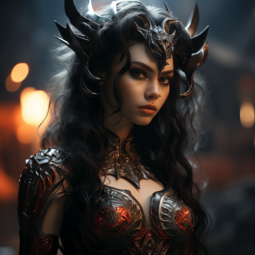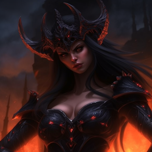 Demoness, Queen of Hell, intimidating, beautiful, red skin, glowing fiery eyes, pointy ears, long black hair, attractive body, menacing, aggressive stance, ray - tracing, ultra quality, Dark Fantasy --s 750 --v 5.1