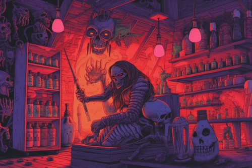 a detailed illustration sticker, scene takes place in a demonic massage studio in hell filled with crystals and bottles of essential oils, a giant evil demon is giving a lady a deep tissue massage --v 5.1 --ar 3:2