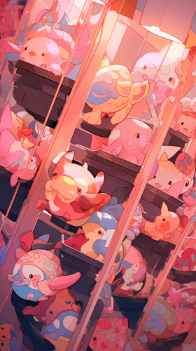 Hell claw machine, win kawaii demonic demon plushies, isometric perspective, --ar 9:16 --niji
