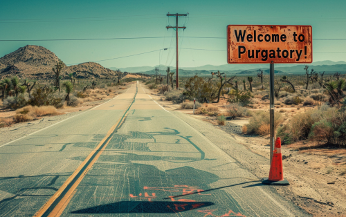 High Desert frightening scary small city, A roadside billboard with "Welcome to Purgatory!" in bold letters, style of vintage imagery vintage fonts, hellscape vista, trompe-l'œil graffiti, intense colors, low scrubland and medium-height rocky buttes vistas, terrifying Hell Hades underworld demons iconic imagery, refined resigned elegance, colorful sidewalk scenes, streamline elegance, desertwave, automatism, promenade, bad dream vibe --v 6.0 --ar 8:5 --style raw