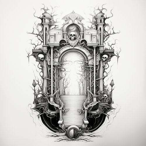 The gates of hell, tattoo design, Neo traditional style, bold outline, whimsical, black and white