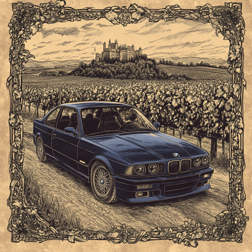 A vintage drawing in high detail of a deep blue BMW M3 (E36) set against a sepia-toned vineyard landscape. The car sits amidst rows of grapevines, with a majestic castle visible in the distant background, adding a touch of historic elegance. The scene is framed by jagged, ornate borders, giving it an old-world feel. The intricate linework captures the car’s classic shape, while the sepia backdrop and vineyard setting create a timeless, nostalgic atmosphere